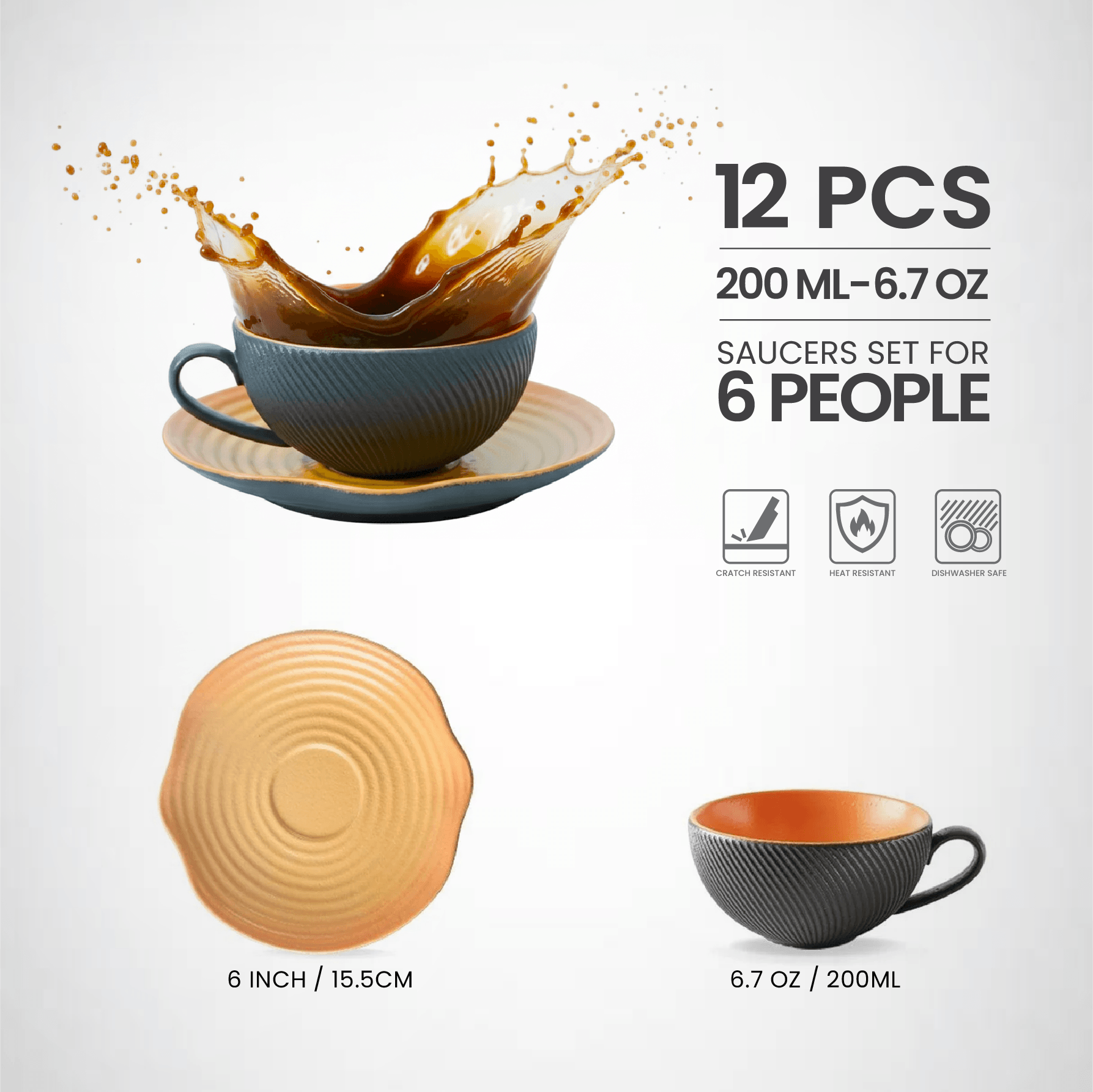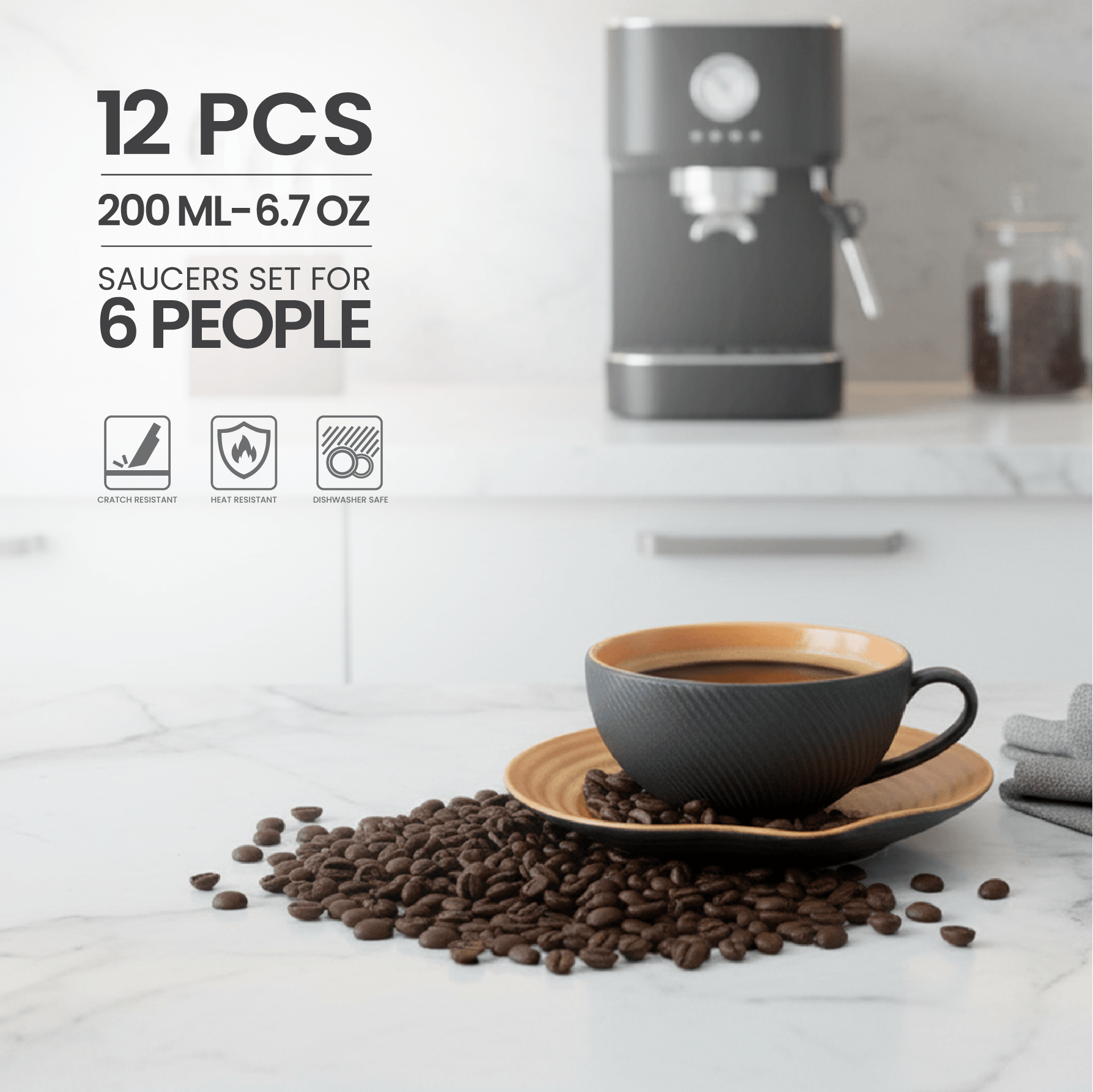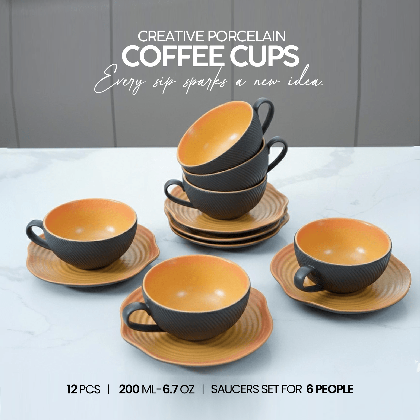 Enhance your coffee break with the 12-Piece Porcelain Coffee Cups & Saucers Set (200 ml - 6.7 Oz) features an elegant design with smooth, rounded edges, offering comfortable grip and easy handling.