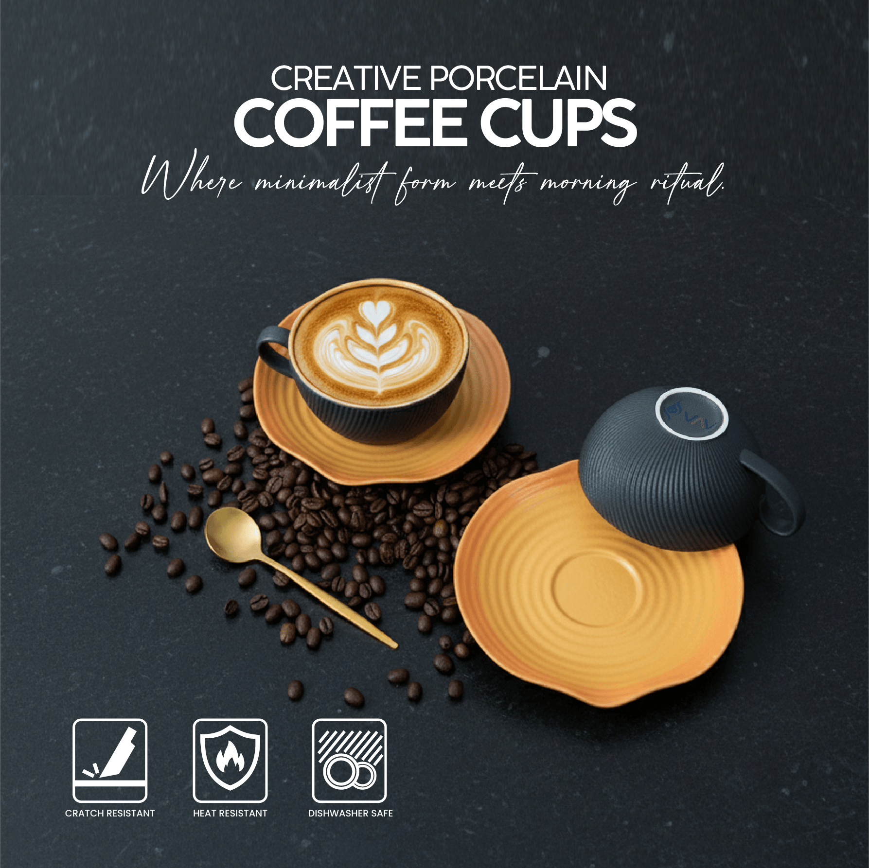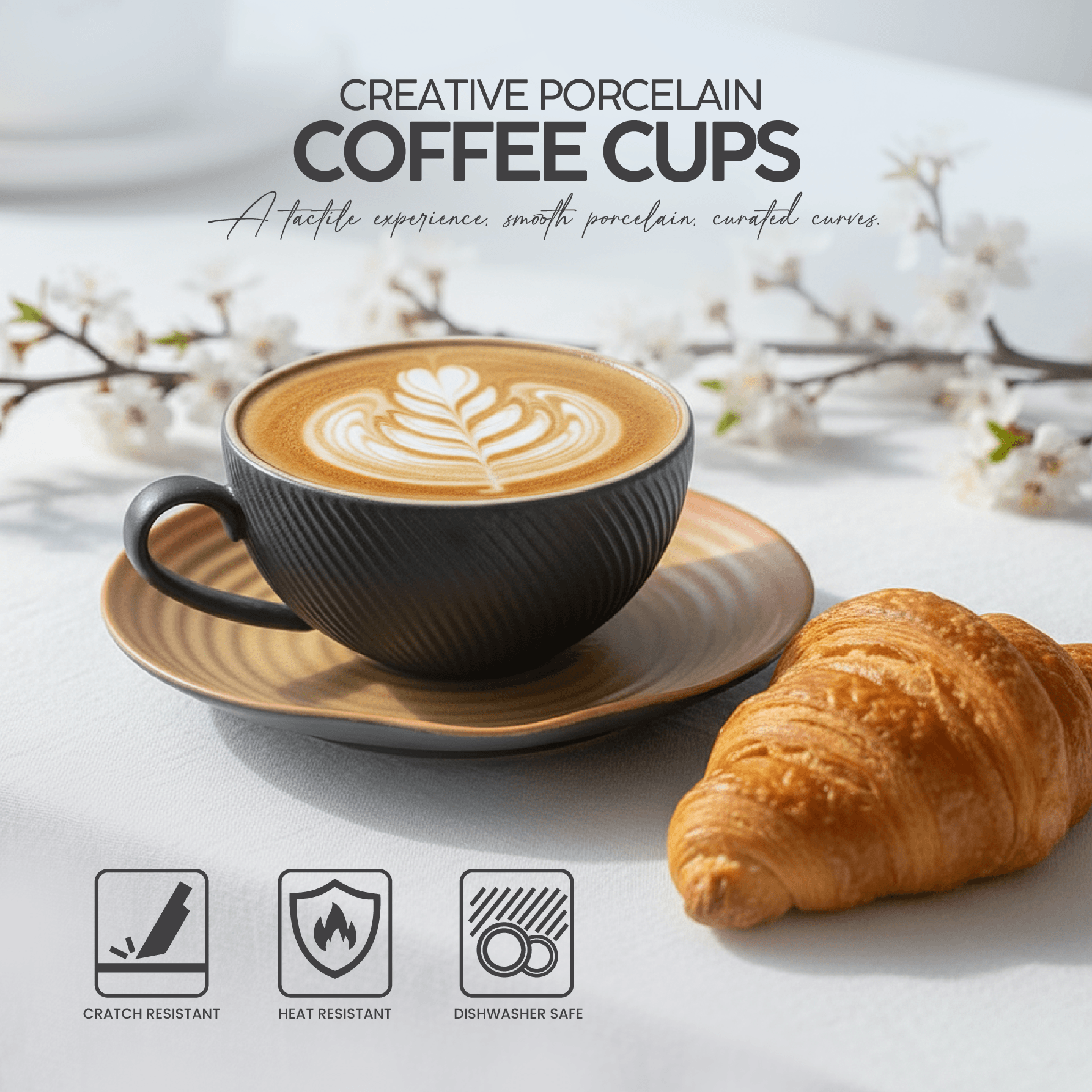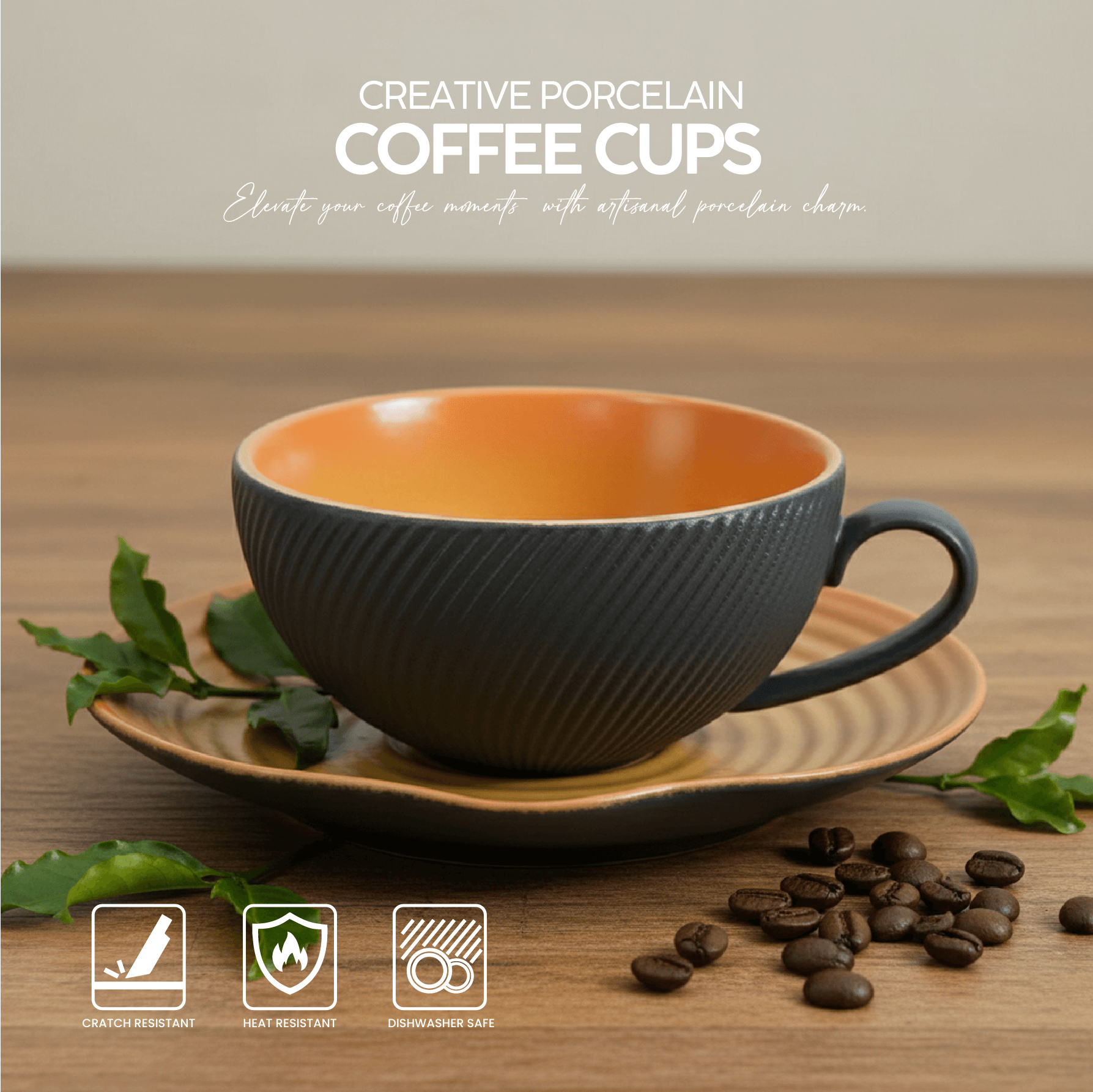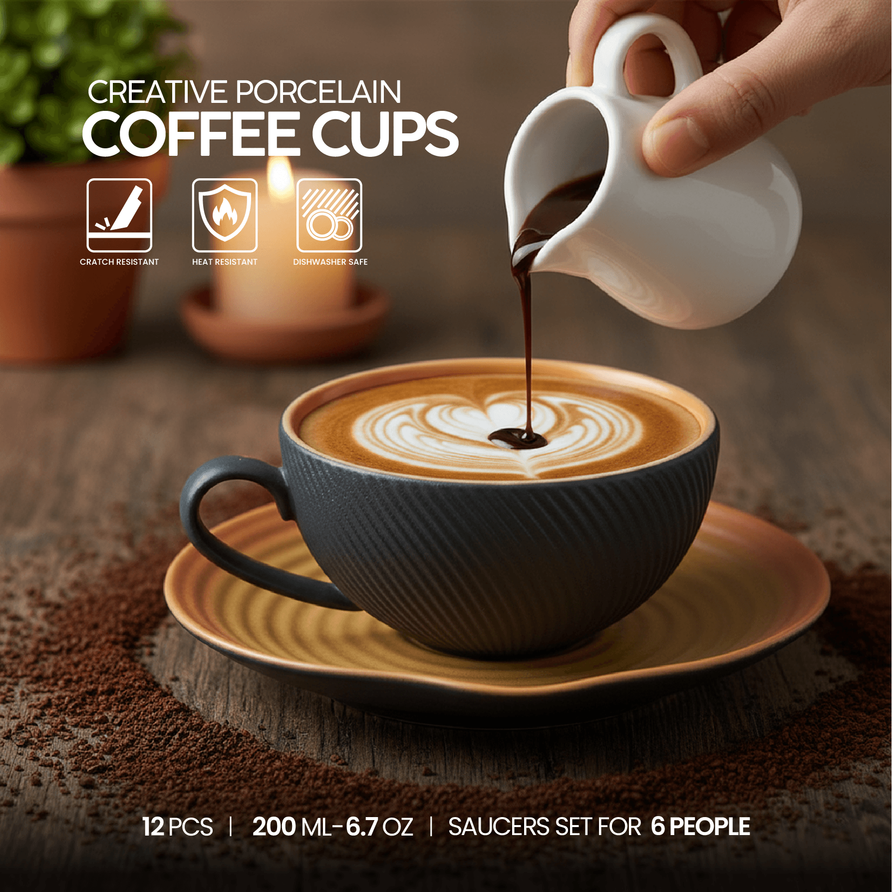 Enhance your coffee break with the 12-Piece Porcelain Coffee Cups & Saucers Set (200 ml - 6.7 Oz) features an elegant design with smooth, rounded edges, offering comfortable grip and easy handling.