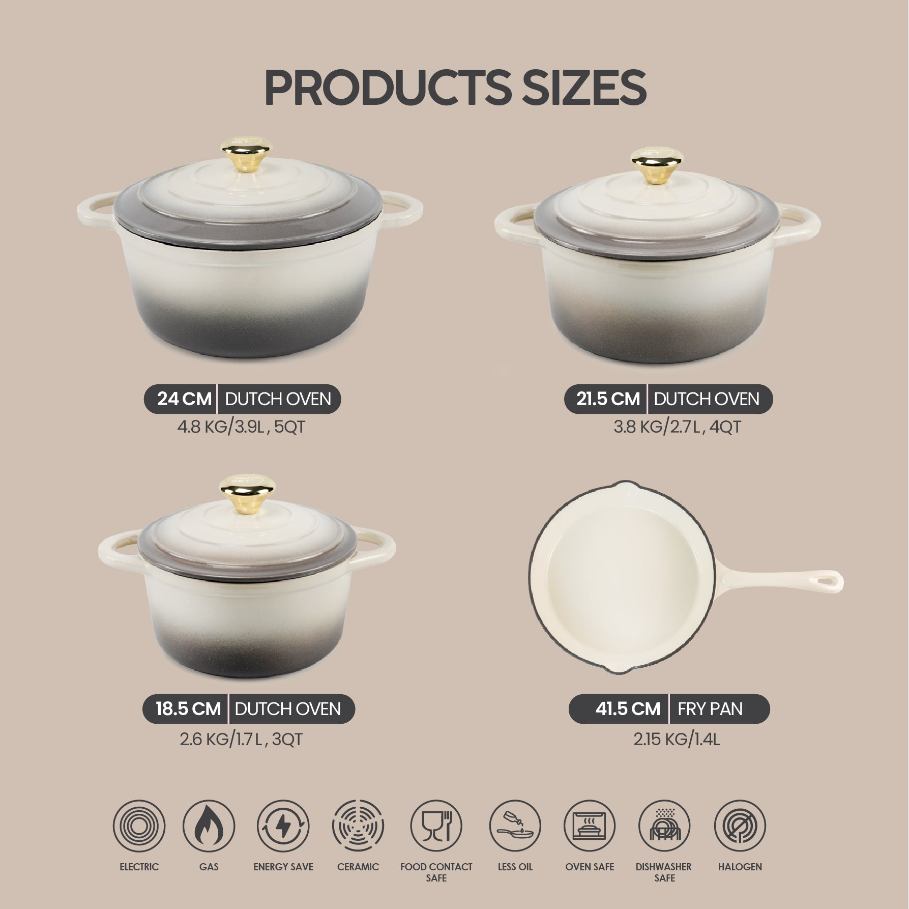 VAV GET Healthy and Safe Non-Stick Enameled Cast Iron 7-Piece Dutch Oven Cookware Set with Gloves and 2-Piece Mills. Includes: 24cm Dutch Oven Fry Pan, 18cm, 21cm, and 24cm Dutch Ovens with Lids, Gloves, and 2-Piece Mills.