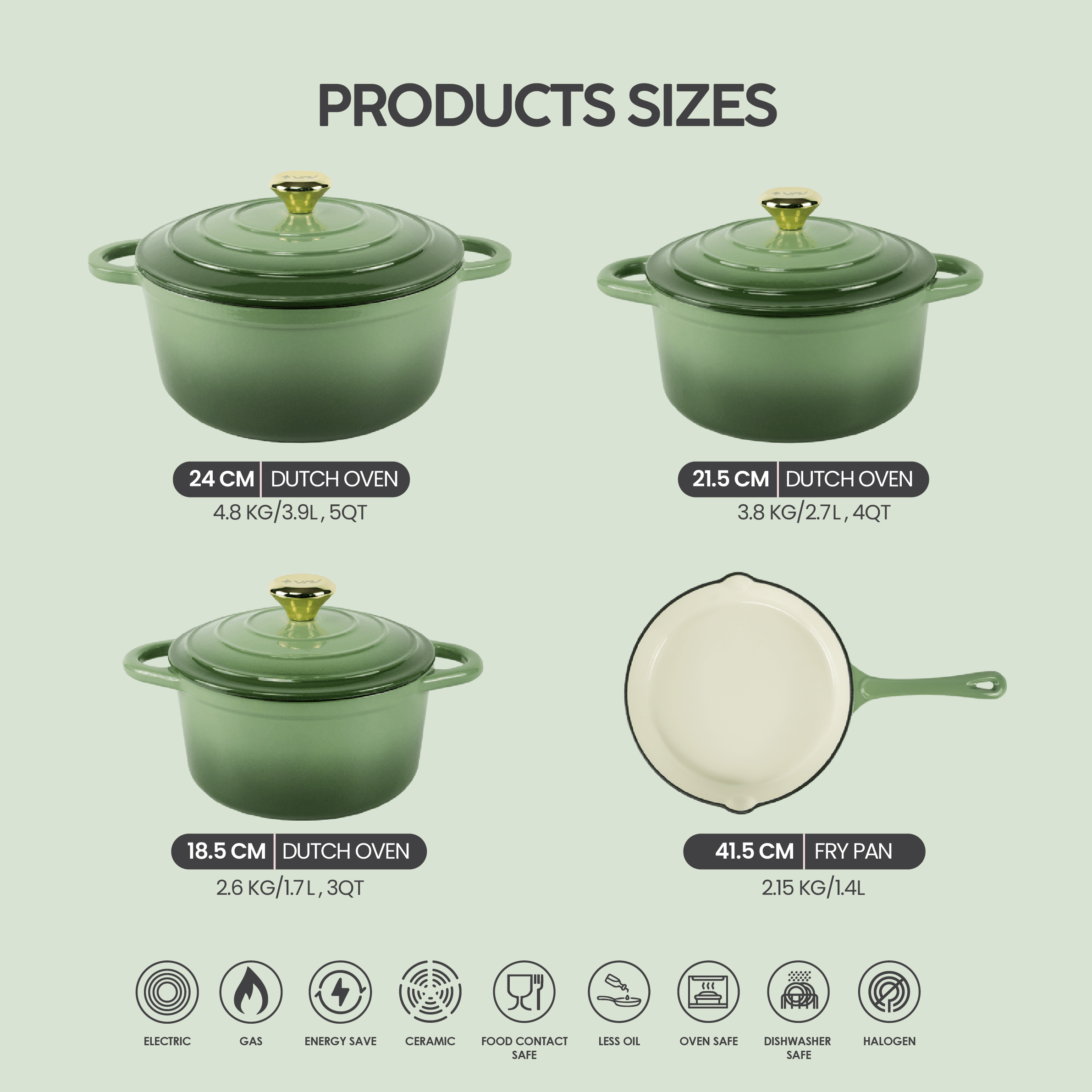 The VAV GET 7-Piece Cast Iron Dutch Oven Cookware Set is designed for superior heat retention, making it perfect for slow cooking, tenderizing vegetables, and preparing rich meat stews. Its even heat distribution also makes it ideal for baking no-knead bread. This enameled, non-stick set is compatible with gas, ceramic, electric, and induction cooktops. Complete with durable lids, protective gloves, and 2-piece mills, it’s a healthy, versatile, and essential addition to every kitchen.