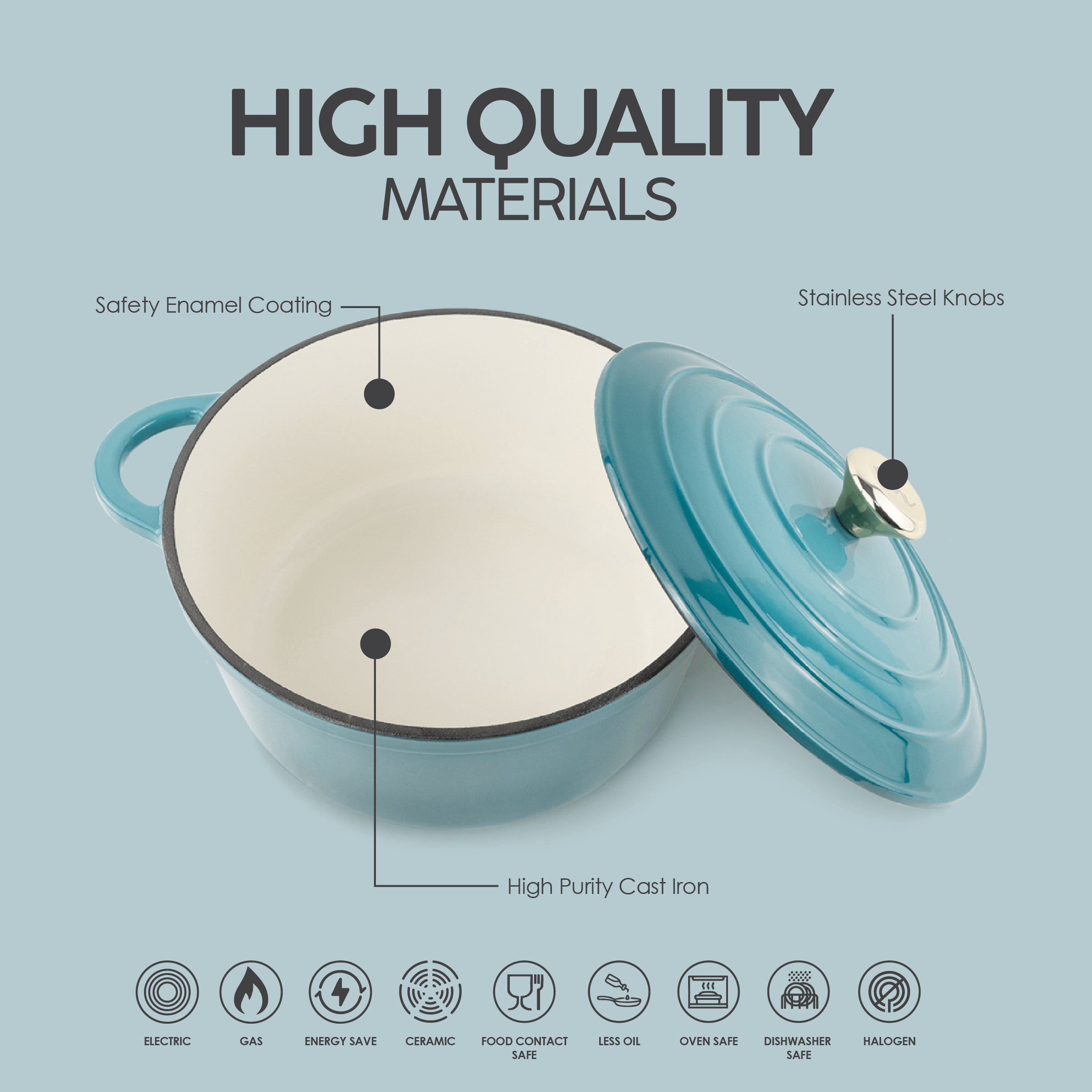 VAV GET Healthy and Safe Non-Stick Enameled Cast Iron 7-Piece Dutch Oven Cookware Set with Gloves and 2-Piece Mills. Includes: 24cm Dutch Oven Fry Pan, 18cm, 21cm, and 24cm Dutch Ovens with Lids, Gloves, and 2-Piece Mills.