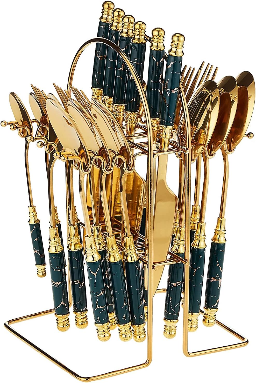 24-PIECE FLATWARE CUTLERY SET FOR 6 PEOPLE. The cutlery set includes: Table Spoons x 6, Dinner Forks x 6, Dinner Knives x 6, and Teaspoons x 6. HIGH-QUALITY STAINLESS STEEL. Durable and heat-resistant Premium Stainless Steel. Dishwasher safe. LONG SERVICE LIFE. Rust-resistant and scratch-resistant. Long service life guaranteed. Easy to use and clean. EXCELLENT SHAPE AND DESIGN. Smooth edges without rough spots. Comfortable handling. Elegant look. Proper weight. Standard sizes. SUITABLE COLOR. Color gives the cutlery set an elegant look. Suitable for every table at home, restaurant, cafe, bar, kitchen, and office.