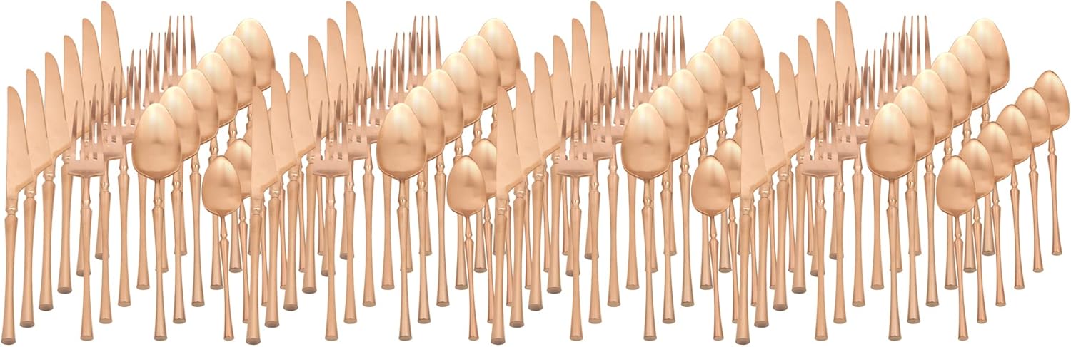 24-PIECE FLATWARE CUTLERY SET FOR 6 PEOPLE. The cutlery set includes: Table Spoons x 6, Dinner Forks x 6, Dinner Knives x 6, and Teaspoons x 6. HIGH-QUALITY STAINLESS STEEL. Durable and heat-resistant Premium Stainless Steel. Dishwasher safe. LONG SERVICE LIFE. Rust-resistant and scratch-resistant. Long service life guaranteed. Easy to use and clean. EXCELLENT SHAPE AND DESIGN. Smooth edges without rough spots. Comfortable handling. Elegant look. Proper weight. Standard sizes. SUITABLE COLOR. Color gives the cutlery set an elegant look. Suitable for every table at home, restaurant, cafe, bar, kitchen, and office.