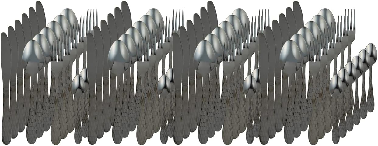 24-PIECE FLATWARE CUTLERY SET FOR 6 PEOPLE. The cutlery set includes: Table Spoons x 6, Dinner Forks x 6, Dinner Knives x 6, and Teaspoons x 6. HIGH-QUALITY STAINLESS STEEL. Durable and heat-resistant Premium Stainless Steel. Dishwasher safe. LONG SERVICE LIFE. Rust-resistant and scratch-resistant. Long service life guaranteed. Easy to use and clean. EXCELLENT SHAPE AND DESIGN. Smooth edges without rough spots. Comfortable handling. Elegant look. Proper weight. Standard sizes. SUITABLE COLOR. Color gives the cutlery set an elegant look. Suitable for every table at home, restaurant, cafe, bar, kitchen, and office.