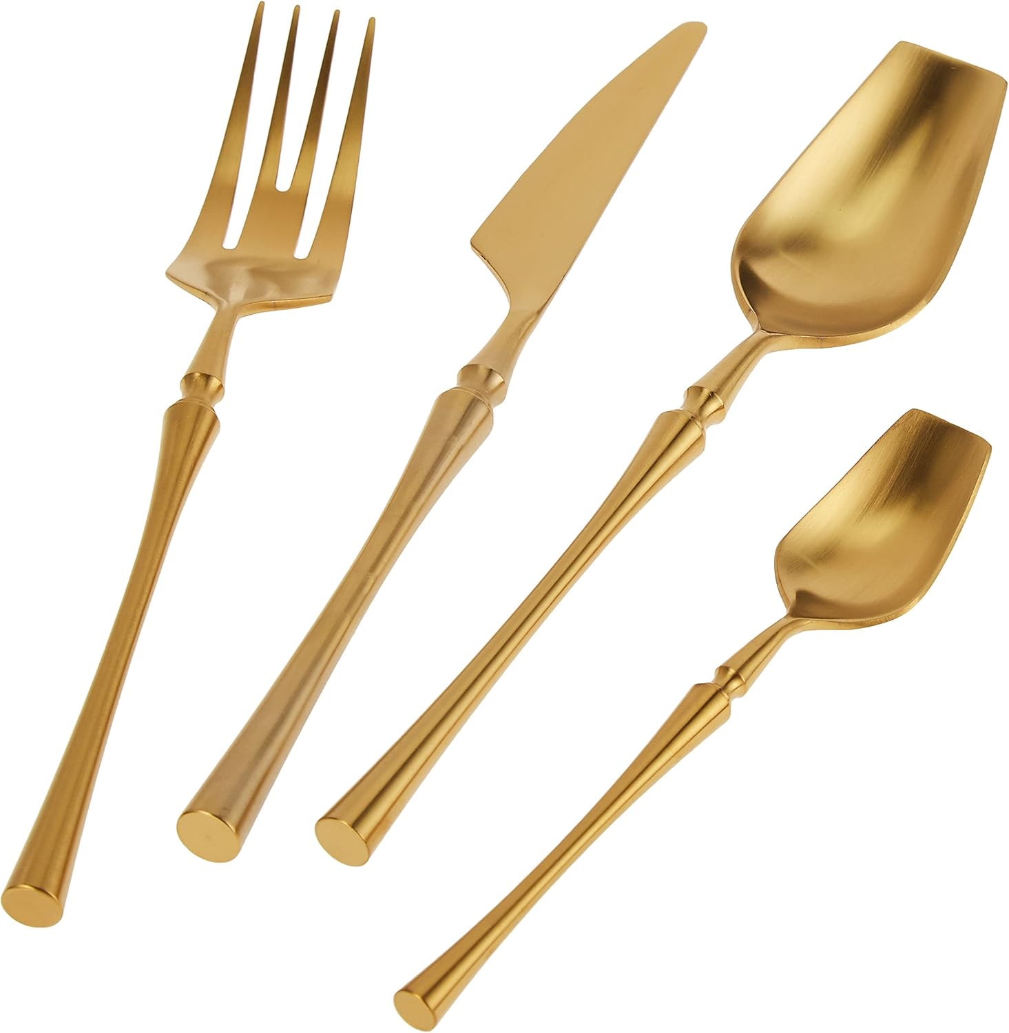 24-PIECE FLATWARE CUTLERY SET FOR 6 PEOPLE. The cutlery set includes: Table Spoons x 6, Dinner Forks x 6, Dinner Knives x 6, and Teaspoons x 6. HIGH-QUALITY STAINLESS STEEL. Durable and heat-resistant Premium Stainless Steel. Dishwasher safe. LONG SERVICE LIFE. Rust-resistant and scratch-resistant. Long service life guaranteed. Easy to use and clean. EXCELLENT SHAPE AND DESIGN. Smooth edges without rough spots. Comfortable handling. Elegant look. Proper weight. Standard sizes. SUITABLE COLOR. Color gives the cutlery set an elegant look. Suitable for every table at home, restaurant, cafe, bar, kitchen, and office.