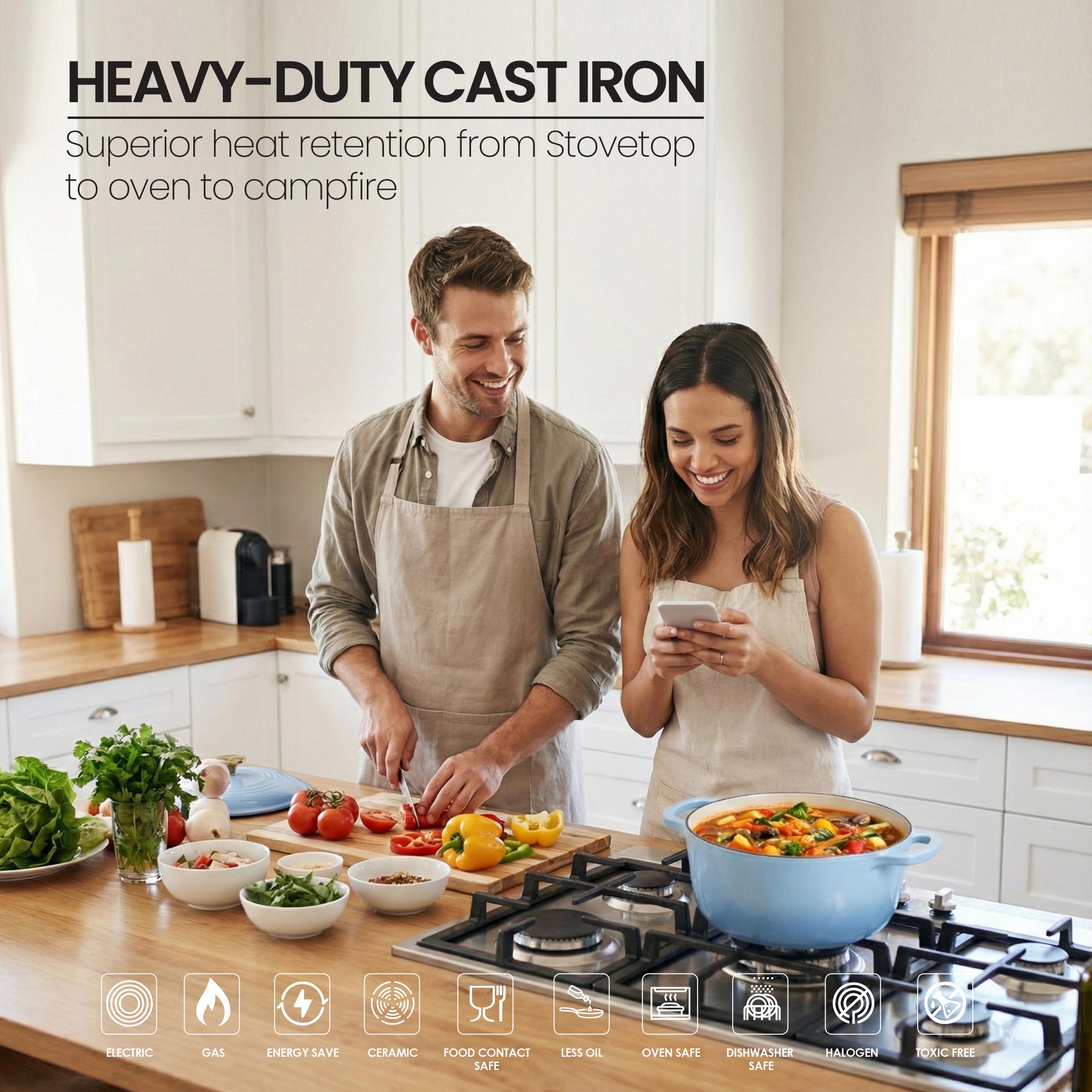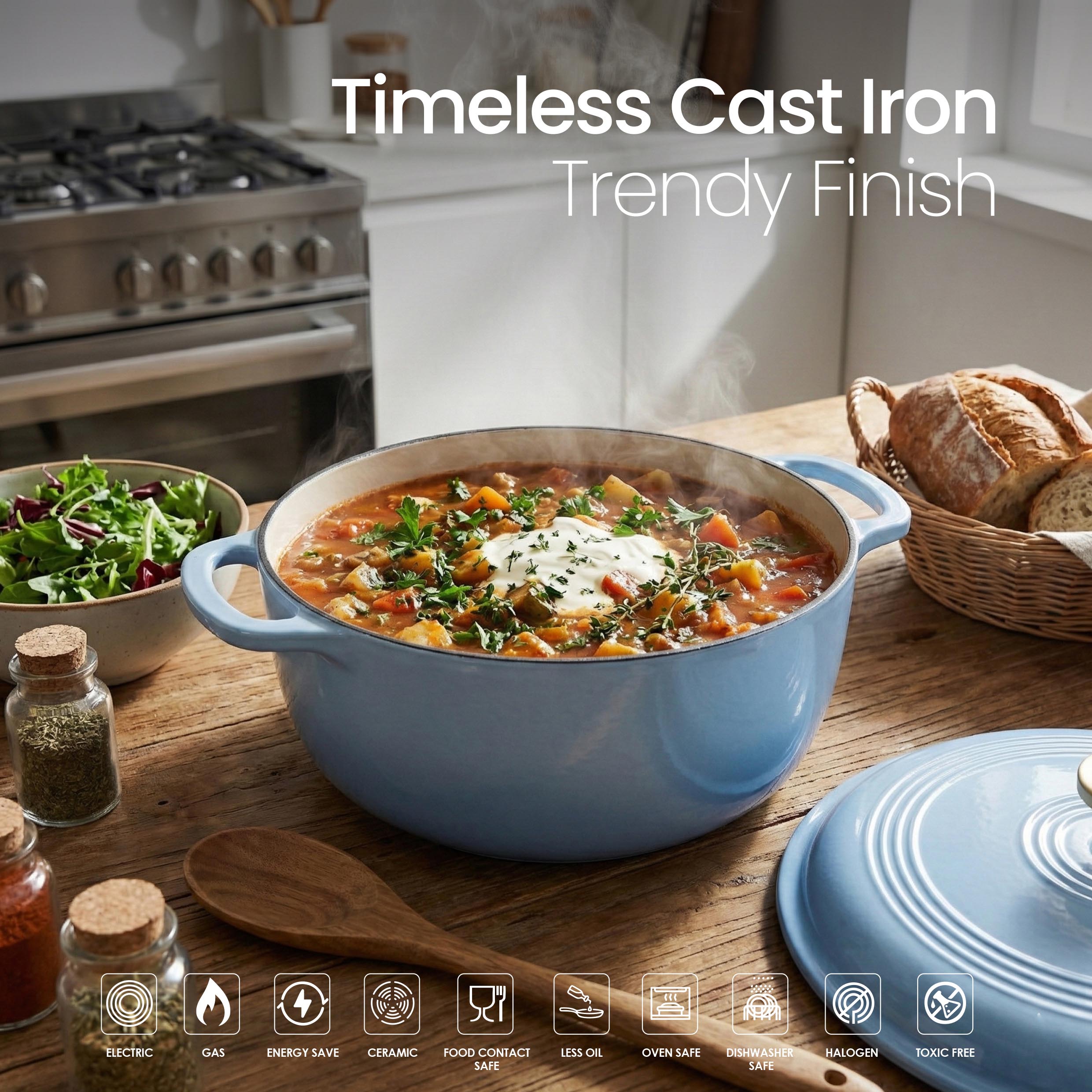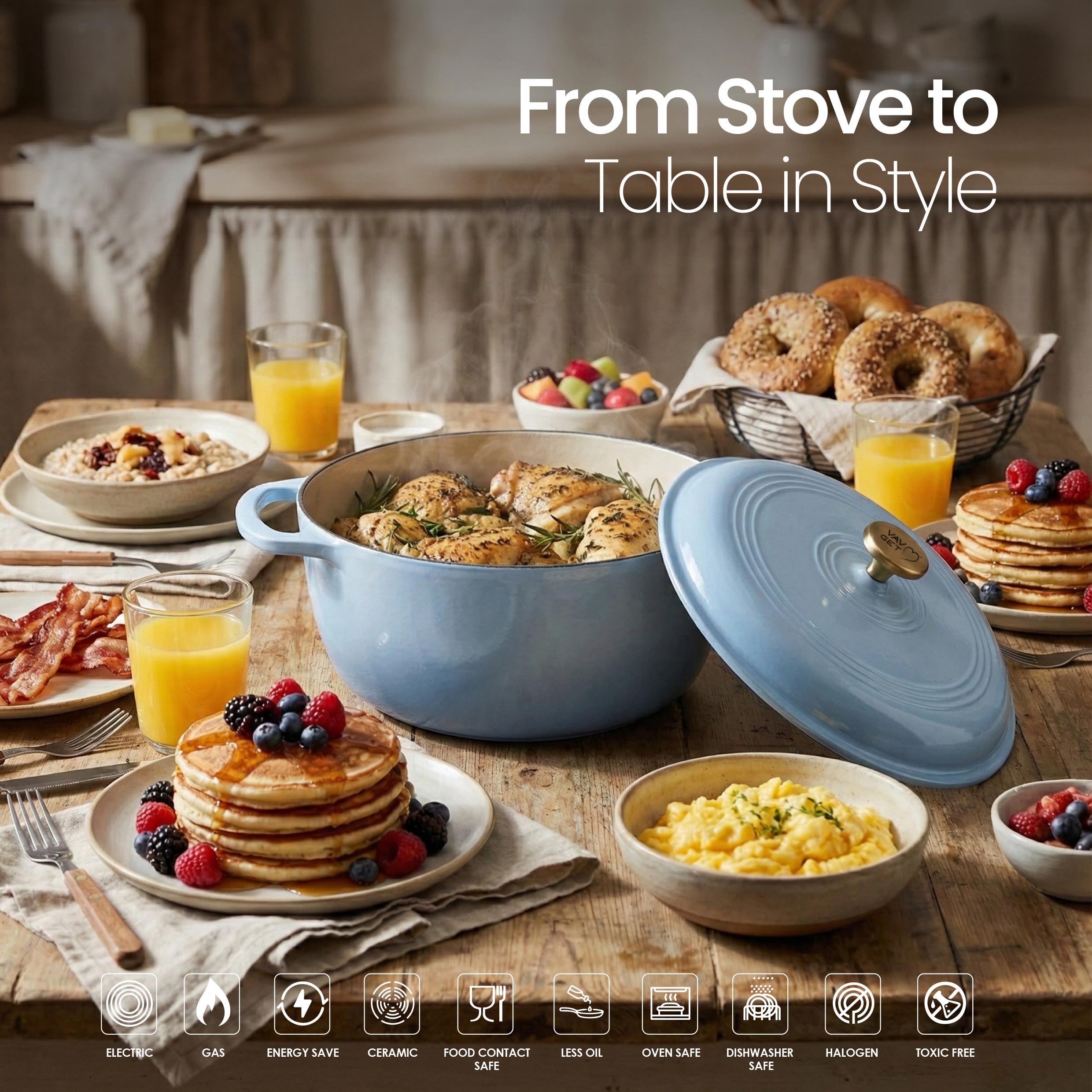 The VAV GET 6QT Healthy Non-Stick Enameled Cast Iron Dutch Oven is crafted for superior heat retention and even cooking, making it perfect for baking bread, slow cooking stews, braising meats, roasting vegetables, and preparing flavorful meals. Its durable enameled cast iron allows healthy low-oil cooking and ensures long-lasting performance. Equipped with a tight-fitting lid and dual handles, this Dutch oven is easy to maneuver, oven-safe, and compatible with gas, electric, ceramic, and induction cooktops. Stylish, versatile, and practical, it is an essential addition to every modern kitchen.