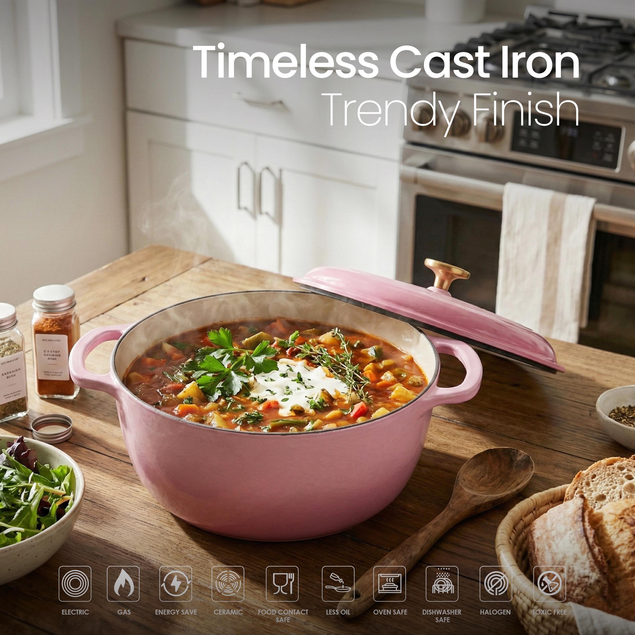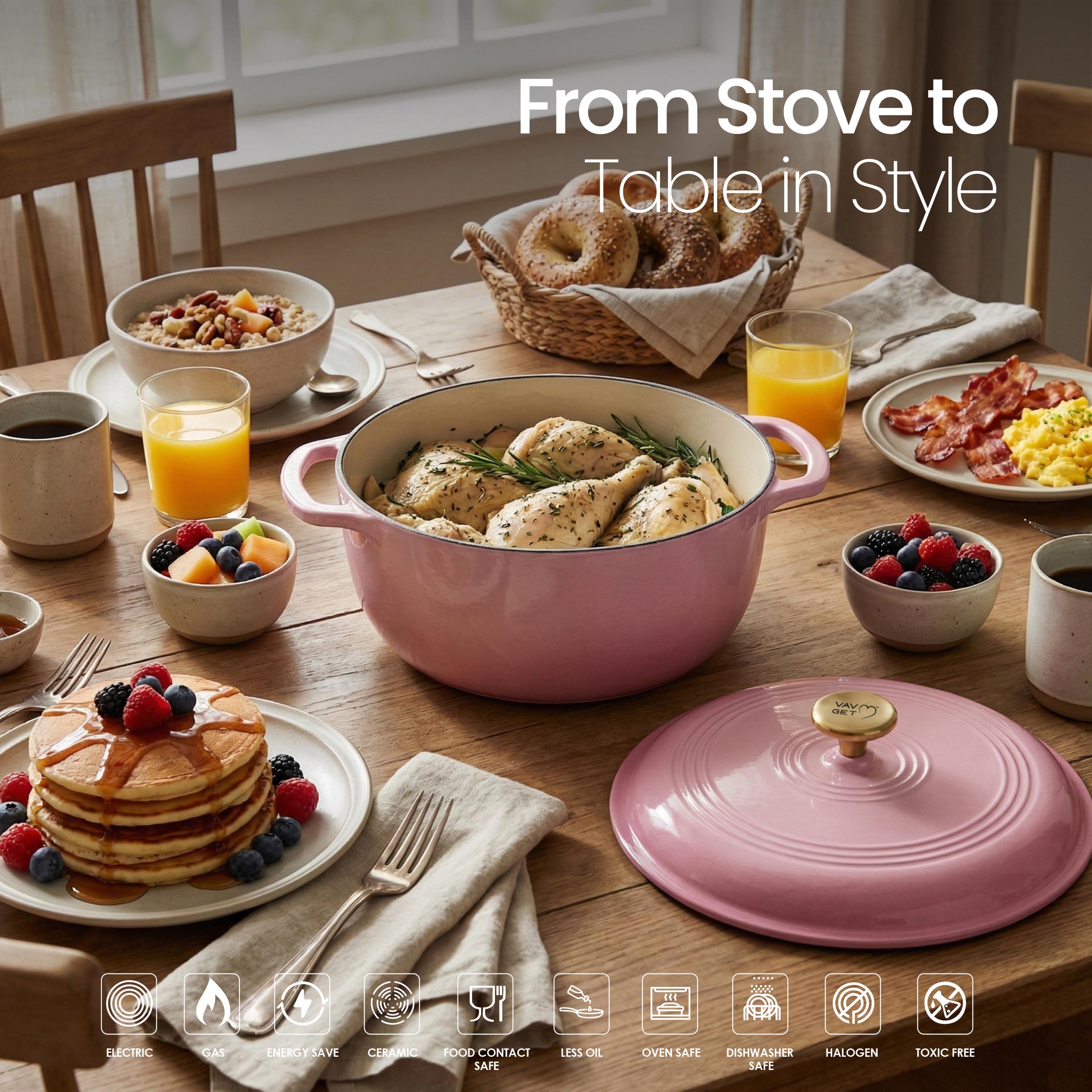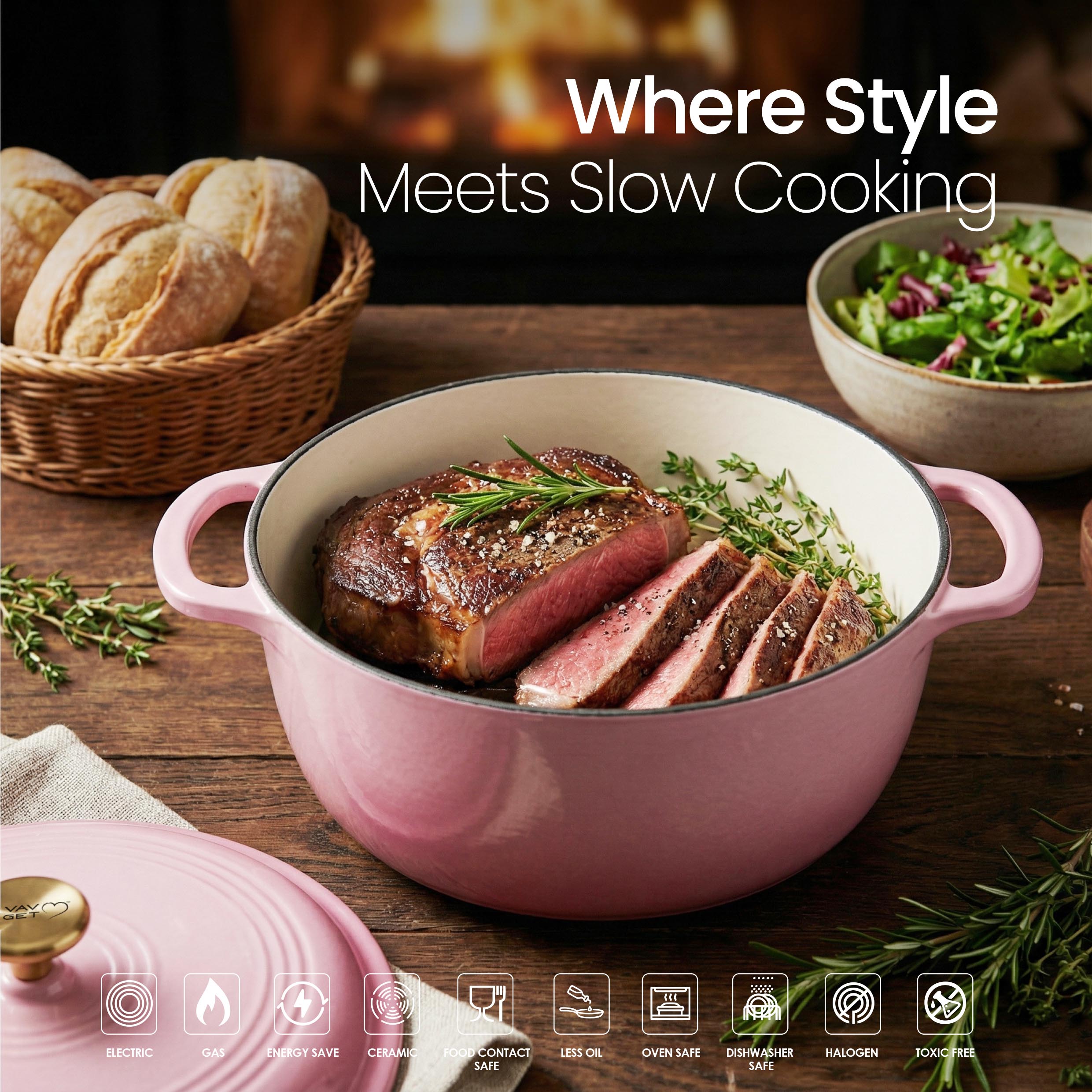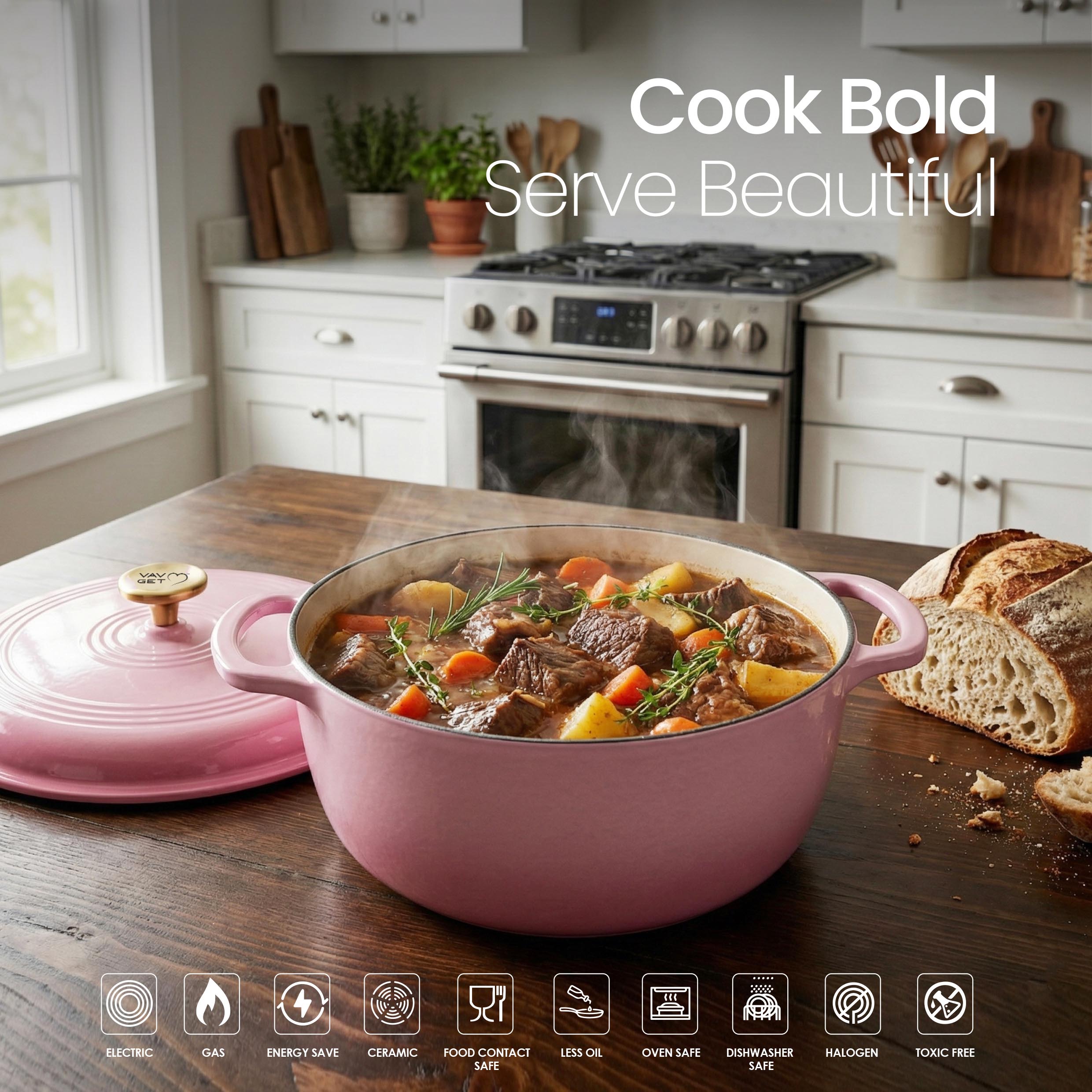 The VAV GET 6QT Healthy Non-Stick Enameled Cast Iron Dutch Oven is crafted for superior heat retention and even cooking, making it perfect for baking bread, slow cooking stews, braising meats, roasting vegetables, and preparing flavorful meals. Its durable enameled cast iron allows healthy low-oil cooking and ensures long-lasting performance. Equipped with a tight-fitting lid and dual handles, this Dutch oven is easy to maneuver, oven-safe, and compatible with gas, electric, ceramic, and induction cooktops. Stylish, versatile, and practical, it is an essential addition to every modern kitchen.