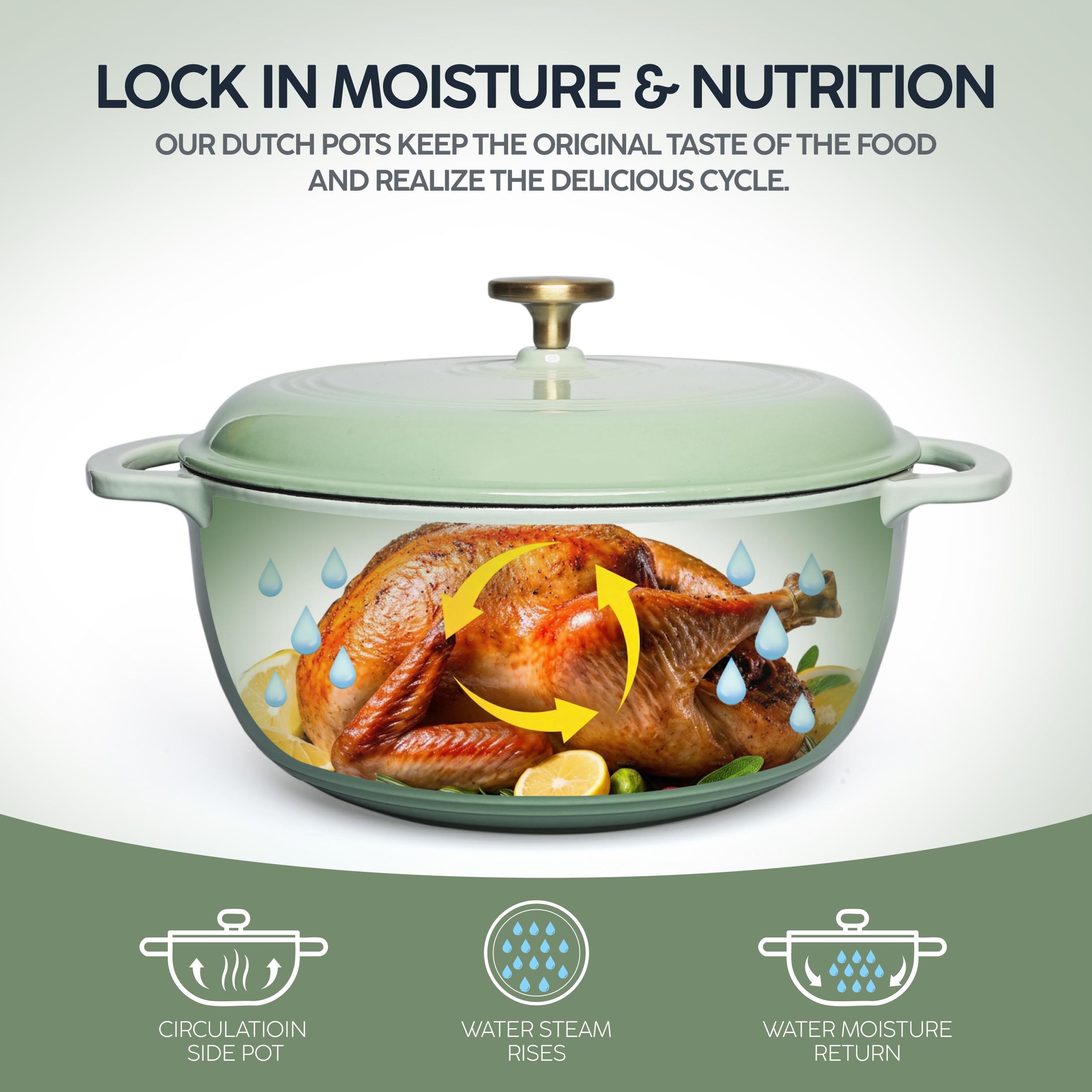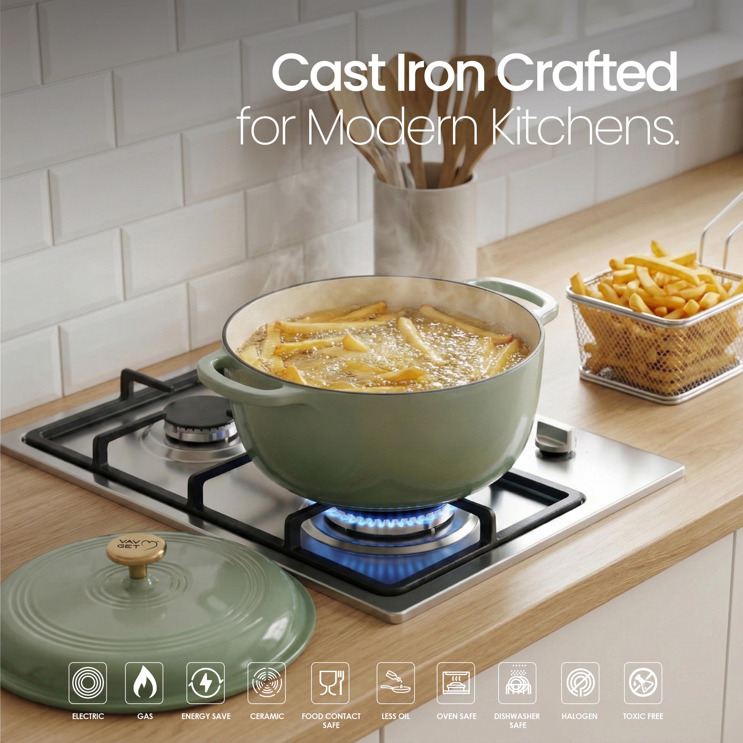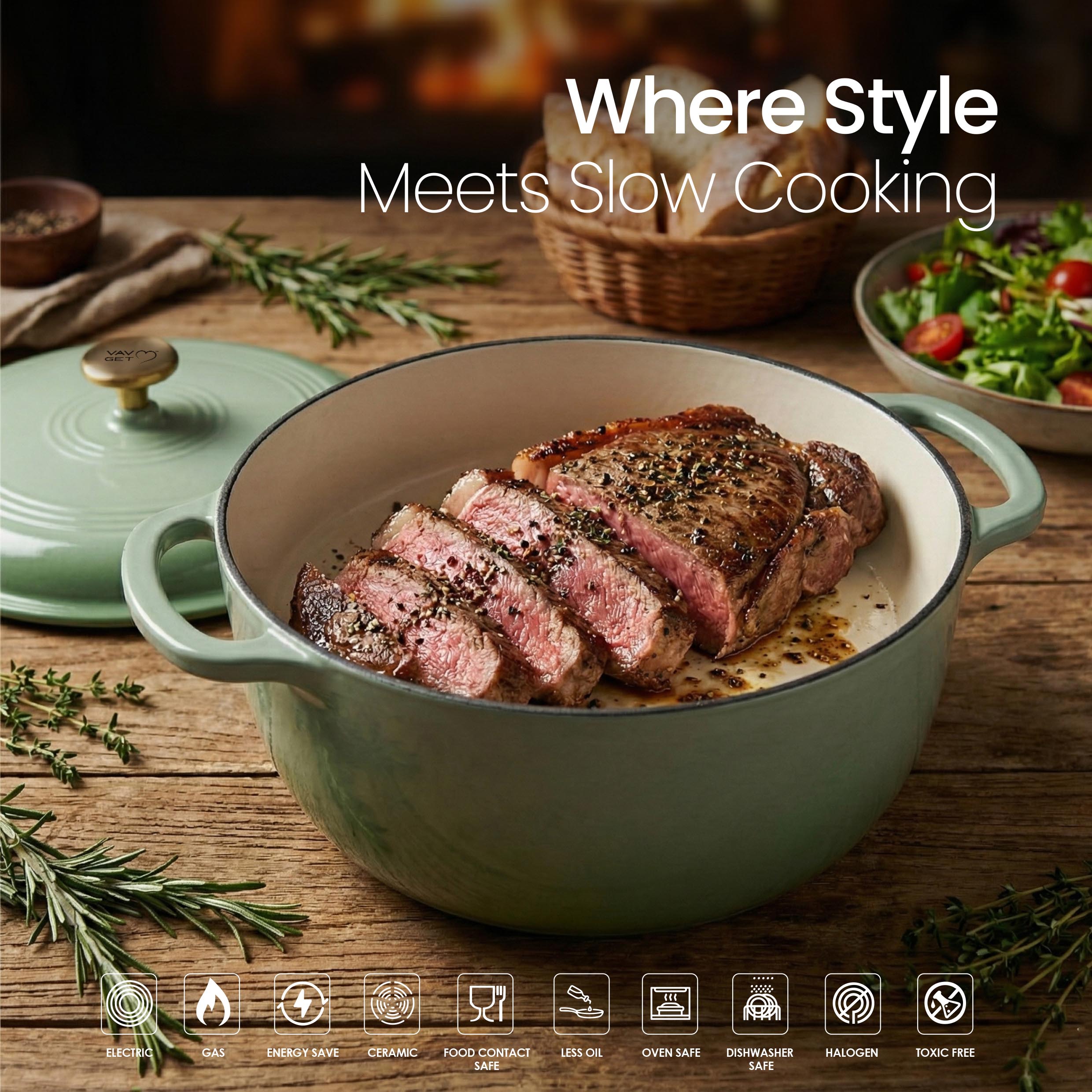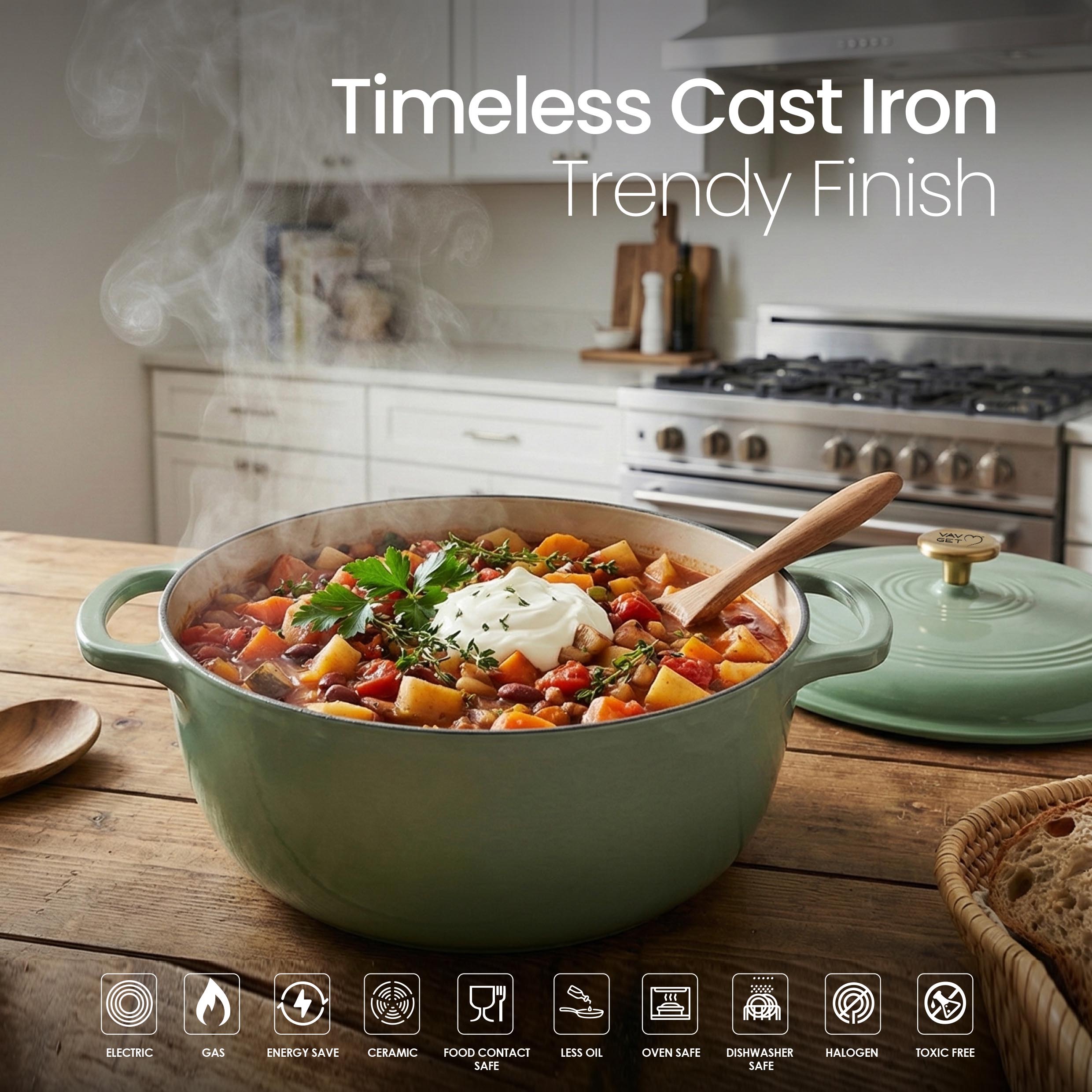The VAV GET 6QT Healthy Non-Stick Enameled Cast Iron Dutch Oven is crafted for superior heat retention and even cooking, making it perfect for baking bread, slow cooking stews, braising meats, roasting vegetables, and preparing flavorful meals. Its durable enameled cast iron allows healthy low-oil cooking and ensures long-lasting performance. Equipped with a tight-fitting lid and dual handles, this Dutch oven is easy to maneuver, oven-safe, and compatible with gas, electric, ceramic, and induction cooktops. Stylish, versatile, and practical, it is an essential addition to every modern kitchen.