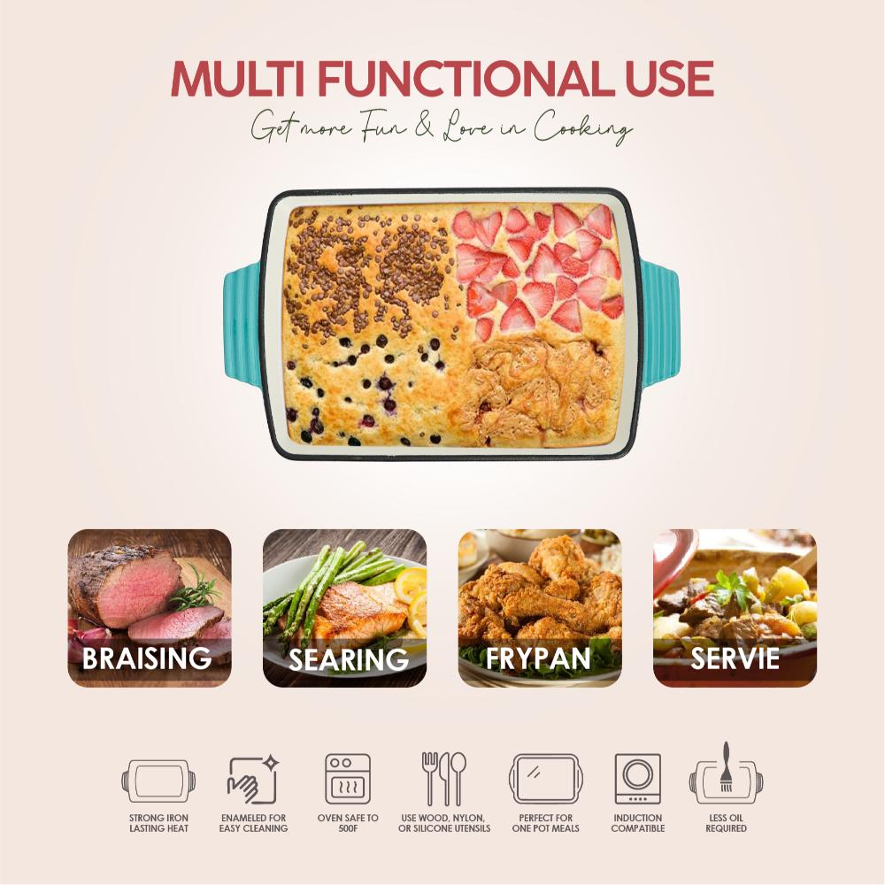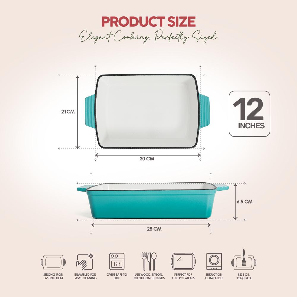 Elevate your cooking experience with the VAV GET Enamel Cast Iron Rectangular Roasting Dish (12-Inch, Teal) – a versatile, durable, and elegant addition to your kitchen. Crafted from premium cast iron with a non-stick enamel coating, this roasting dish ensures superior heat retention and even cooking, making it ideal for baking, roasting, and serving. Its sleek cream finish blends seamlessly into modern kitchens, while the easy-clean enamel interior prevents food from sticking. Perfect for everyday meals or special gatherings, this dish is oven safe up to 500°F and works on induction, gas, ceramic, and electric stovetops.